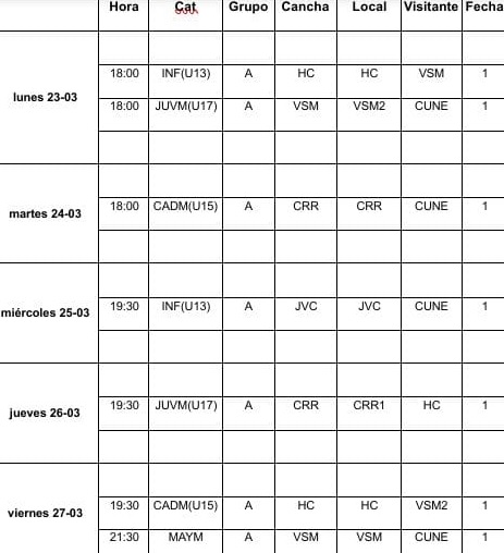 En esta priimera programación, habrán partidos toda la semana, aunque habrán dos juegos como máximo, e involucra a las categorías U13, U15, U17 y Primera.